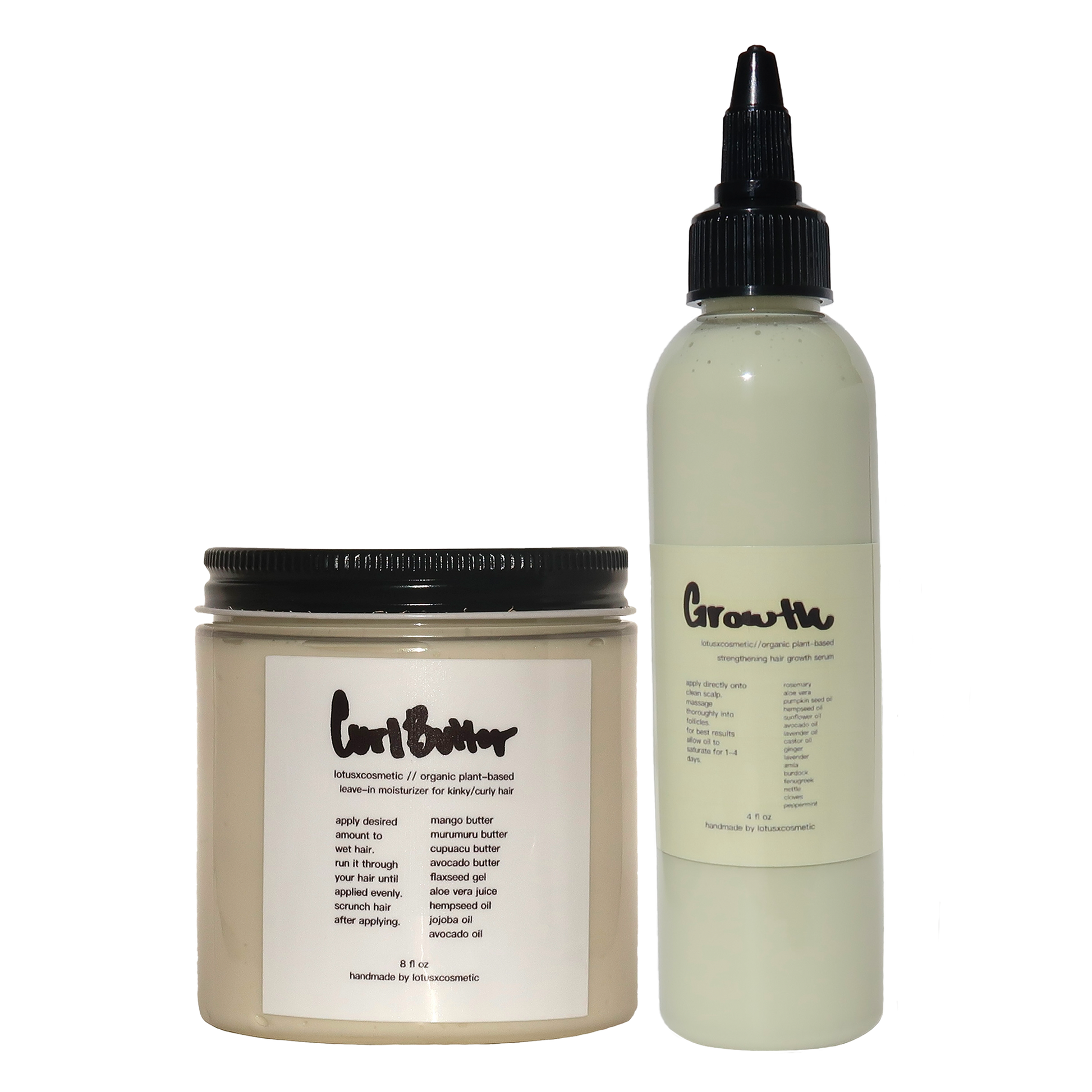 Curl Butter- Organic Aloe Juice, Mango Butter, Murmuru Butter, Cupuacu Butter, Aloe Vera, Avocado Butter, Flaxseed Gel, Hempseed Oil, Jojoba Oil, Avocado Oil, Jasmine Oil.